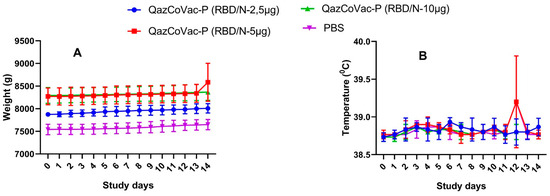 We performed the pyrogenicity assessment of experimental batches of QazCoVac-P in accordance with the State Pharmacopoeia of the Republic of Kazakhstan. The pyrogenic properties of the product was tested by measuring the body temperature in rabbits. In this preclinical study of QazCoVac-P’s safety, apyrogenicity, and purity from BE, we used the vaccine’s bulk products made from recombinant polypeptides SARS-CoV-2 virus’s S-protein receptor binding domain (VBP-RBD) and nuclear phosphoprotein (VBP-N) with no adjuvant, since AddaS03™ is produced in strict aseptic conditions, it is sterile, and its endotoxin content does not exceed <10 EU/mL.