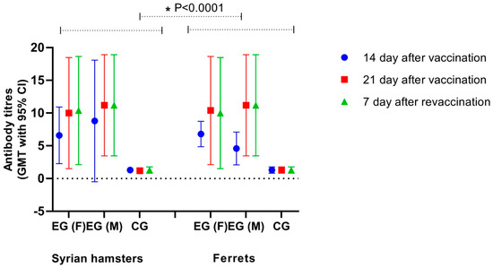 Our assessment of immune responses in animals vaccinated twice showed that the highest GMT of antibodies in their blood sera was equal to 8 log2.