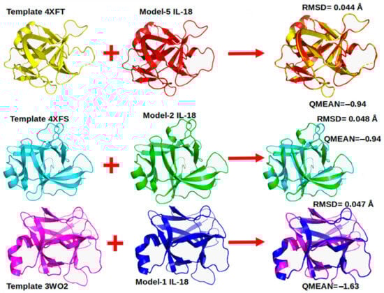 With the selected template, models by homology were generated, and the Swiss-Model web server built the pig IL-18 3D model based on and validated by MolProbity [37] and QMEAN [38]. This parameter suggests whether the predicted IL-18 structure through the homology modeling approach is comparable to the expected structure using other experimental structures of similar size and structure [30,38]. To select the best models, we took the QMEAN as a reference value (0 to −4 range), where a QMEAN value around 0 suggests the high quality of the homology-modeled protein structure [38,39]. The structural analysis of the generated models and the figures were obtained using Pymol Version 2.3.0 [40,41].