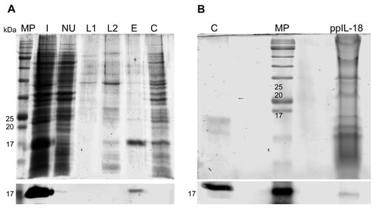 SDS-polyacrylamide gel electrophoresis (SDS-PAGE) analysis was performed in 15% gels and stained with Coomassie blue solution. For Western blot analysis, proteins were transferred onto a nitrocellulose membrane (Schleicher and Schuell, Dassel, Germany) using a semi-dry TransBlot-Turbo electro-blotter (Bio-Rad, Hercules, CA, USA). Mouse anti-pIL-18 monoclonal antibody (eBioscience, San Diego, CA, USA) was used as the primary antibody, and donkey anti-IgG mouse IRDye 800cw (LI-COR, Lincoln, NE, USA) was used as a secondary antibody. Infrared signals were measured using the Odyssey System from LI-COR Biosciences (Lincoln, NE, USA).