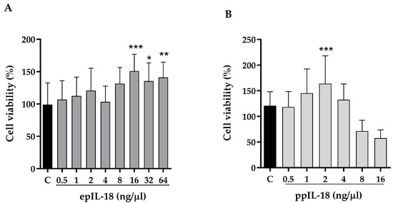 Lymphocyte proliferation assay. Lymphocytes isolated from peripheral blood were incubated with increasing concentrations of recombinant porcine IL-18. (A) Concentrations of 0.5, 1, 2, 3, 4, 8, 16, 32 and 64 ng/μL of epIL-18 and (B) 0.5, 1, 2, 3, 4, 8 and 16 ng/μL of ppIL-18, for 24 h. Cell viability was analyzed with the MTT assay to establish the proliferation of treated lymphocytes concerning the control (C). Values are mean ± SD, n = 3, statistical analysis was performed with one-way ANOVA, * p < 0.05, ** p < 0.01, *** p < 0.001.