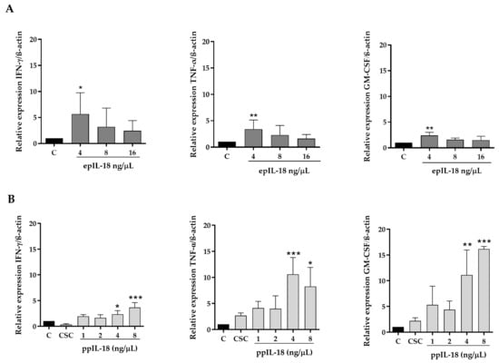 Peripheral blood lymphocytes were isolated and treated for 24 h with different concentrations of ppIL-18 (1, 2, 4, and 8 ng/µL) or epIL-18 (4, 8, and 16 ng/µL). Total RNA was isolated from the cells, and the relative expression of IFN-γ, TNF-α, and GM-CSF was analyzed by qRT-PCR using β-actin as the endogenous control (Figure 4).