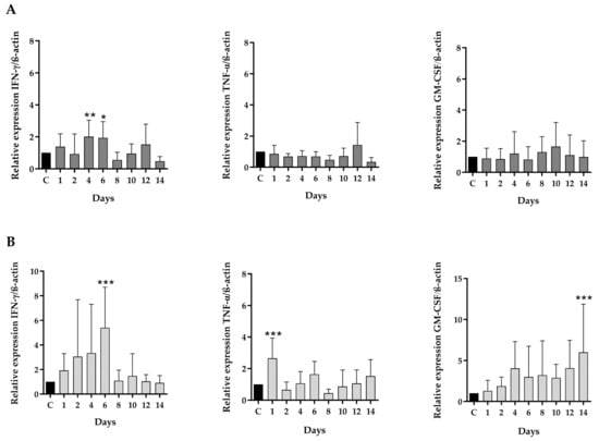 Analysis of pro-inflammatory markers in pigs. The pigs were inoculated via intramuscular injection with a formulation including (A) 100 μg of epIL-18 or (B) 100 μg of ppIL-18. Blood samples were taken, peripheral blood lymphocytes were isolated, RNA was extracted, and qRT-PCR was performed. The percentage of the mRNA levels of the genes of the pro-inflammatory proteins IFN-γ, TNF-α, and GM-CSF was compared with the control of day 0. C: day cero. Values are mean ± SD, n = 5, one-way ANOVA statistical analysis, * p < 0.05, ** p < 0.01, *** p < 0.001.