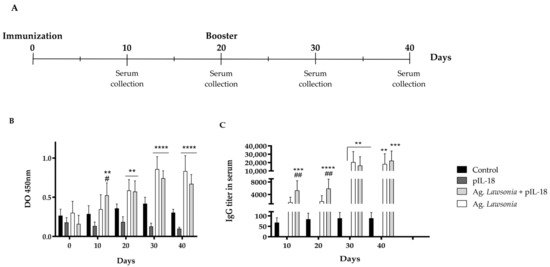 Previously, Montesino et al. have reported a significant increase in antibodies at week 4 post-administration of the L. intracelullaris vaccine candidate [24]. However, when quantifying the antibody titers, we can observe significant differences from day 10 in the pigs injected with the vaccine candidate co-formulated with ppIL-18, which is equal to the group with the vaccine candidate at day 30 post-administration (Figure 7). Antigen co-formulation with ppIL-18 increases the antibody titer by 20 days compared with the group vaccinated only with the antigens. This result indicates that the use of IL-18 as a vaccine adjuvant with these recombinant antigen formulations induces a positive effect in a shorter period, even before the booster, with a reduction in the therapeutic window under this vaccination strategy.