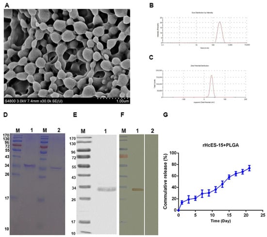 Figure 1. This study extensively investigated the physical properties and structure of antigen-loaded nanoparticles (NPs) using observations at a magnification of 10,000×. This encompassed a detailed analysis of antigen integrity following its integration into the nanoparticles, purification methodologies, Western blot assays, and the cumulative release kinetics. The findings were systematically categorized into several sections: Subsection (A) showcased scanning electron microscopy (SEM) images, offering visual insights into the morphology of rHcES-15+PLGA NPs containing 6% PVA. Subsection (B) presented the distribution of sizes for the antigen-loaded NPs. Subsection (C) illustrated the zeta potential, a critical measure of surface charge, of these NPs. Subsection (D) demonstrated sodium dodecyl sulfate–polyacrylamide gel electrophoresis (SDS-PAGE) outcomes that confirmed the antigen’s integrity post-incorporation into the polymeric matrix. This analysis included standard molecular weight markers, pure rHcES-15, and rHcES-15 attached to PLGA NPs. Subsections (E,F) explored the purification strategy involving chromatography and Western blotting for validation of the recombinant protein (rHcES-15). A discrepancy in observed molecular weight (33 kDa) was attributed to an additional fused vector protein (18 kDa). Deducting the vector protein’s size verified the anticipated 15 kDa size for rHcES-15. The Western blot analysis further confirmed the presence of the purified rHcES-15 protein via specific probing with rat anti-rHcES-15 sera. Subsection (G) presented the release profile of the antigen from PLGA NPs under physiological conditions (pH 7.4, 37 °C) over 21 days, demonstrating the percentage of antigen released over time.