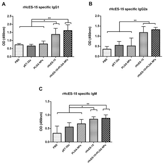 In this experiment, the concentrations of IgM, IgG1, and IgG2a antibodies in sera collected from distinct mice were quantified using ELISA, as depicted in Figure 2. Notably, the IgG1 levels in both the rHcES-15 and rHcES-15+PLGA NPs groups were significantly higher compared to the PBS (blank control), pET-32a, and notably higher than the PLGA NPs groups alone (* p < 0.05, ** p < 0.01). Additionally, mice administered with the antigen (rHcES-15) and the nanovaccine (rHcES-15+PLGA NPs) displayed significantly higher levels of IgG2a and IgM compared to the PBS, pET-32a, and PLGA NPs groups (* p < 0.05, ** p < 0.01).