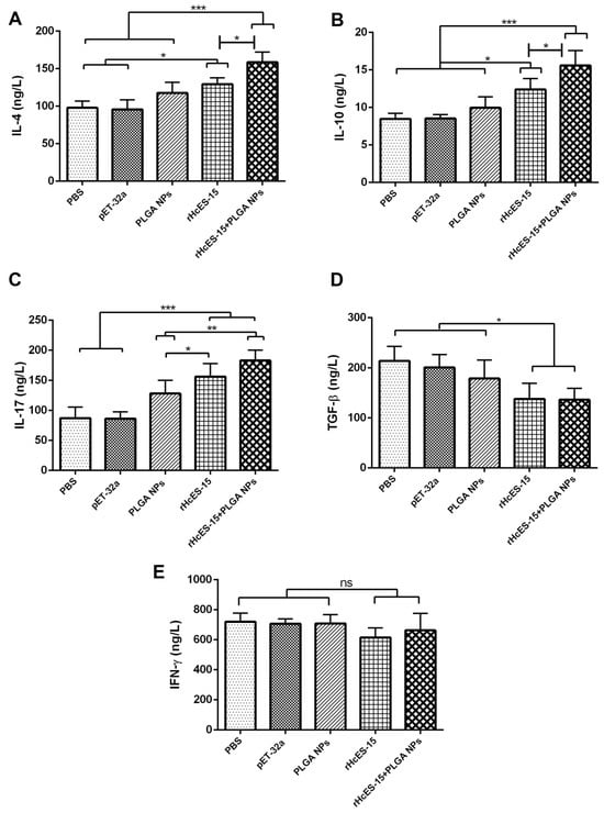 Compared to the PBS group, both the rHcES-15 and rHcES-15+PLGA NPs groups showed significant increases in IL-17 levels (*** p < 0.001). Furthermore, IL-17 secretions were significantly enhanced in these groups compared to the pET-32a and PLGA NPs groups (* p < 0.05, ** p < 0.01). Moreover, the group of mice that received the nanovaccine induced more IL-17 (* p < 0.05) than the rHcES-15 group (Figure 3C).