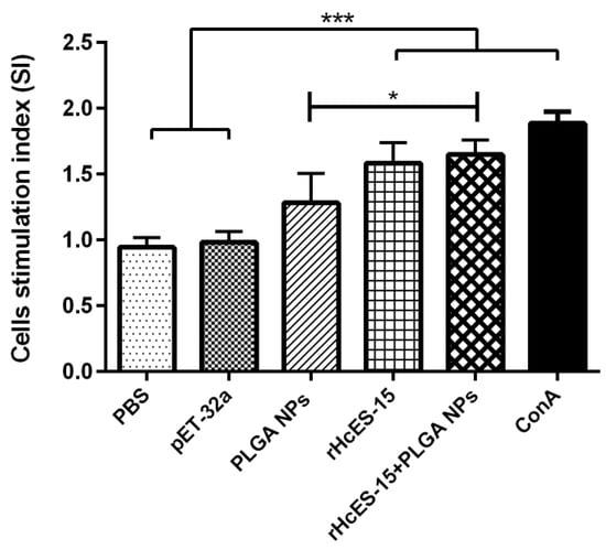 Splenic lymphocytes isolated from all experimental mice were subjected to evaluation for their proliferative responses, particularly in response to the rHcES-15, as illustrated in Figure 4. The stimulation index (SI) revealed substantial proliferation in the positive control (ConA), rHcES-15+PLGA NPs, and rHcES-15 groups compared to the PBS, pET-32a, and PLGA NPs groups (* p < 0.05, *** p < 0.001). Notably, the positive control (ConA) exhibited the highest proliferative response in comparison to both the rHcES-15 and rHcES-15+PLGA NPs groups.