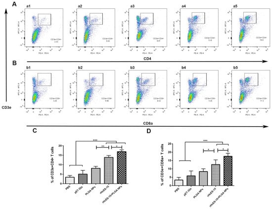 Figure 5. The alterations in the proportions of CD4+ and CD8+ T cells within different mouse groups were quantified through flow cytometry analysis. Figure 5 illustrates the impact of distinct treatments on CD4+ and CD8+ T cell proportions (A,B). In panels A and B, a1 and b1 represent the PBS group (blank control), a2 and b2 depict the pET-32a vector protein group, a3 and b3 represent the PLGA NPs group, a4 and b4 represent the rHcES-15 group, and a5 and b5 represent the rHcES-15+PLGA NPs group. The graphical representation of CD4+ and CD8+ T cell percentages across all groups is depicted in Figure 5, panels (C,D). The findings presented here are derived from a singular experiment, indicative of three independent experiments (* p < 0.05, ** p < 0.01, *** p < 0.001).