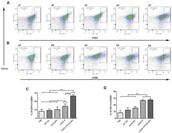 Figure 6. Flow cytometry analysis was utilized to investigate how different antigen delivery systems influence maturation and antigen presentation in splenic dendritic cells. The levels of CD11c+CD83+ and CD11c+CD86+ expression in splenic dendritic cells were assessed across five groups (A,B). In panels (A,B), a1 and b1 represent the PBS group (blank control), a2 and b2 depict the pET-32a vector protein group, a3 and b3 represent the PLGA NPs group, a4 and b4 represent the rHcES-15 group, and a5 and b5 represent the rHcES-15+PLGA NPs group. The data presented in (C,D) showed the percentages of CD11c+CD83+ and CD11c+CD86+ cells as the mean ± SEM of triplicate experiments (* p < 0.05, ** p < 0.01, *** p < 0.001).