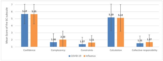 Perceived risks concerning an infection with COVID-19 and influenza seem to be moderate, and vaccinations are considered necessary preventive measures (item “complacency” toward COVID-19: M = 1.66, SD = 1.21, item “complacency” toward influenza: M = 2.03, SD = 1.34). The physical availability, affordability, and accessibility of both vaccinations are not perceived as actual constraints the getting immunized (item “constraints” COVID-19: M = 1.37, SD = 1.00; item “constraints” influenza: M = 1.61, SD = 1.15). Furthermore, our study participants are willing to protect others with their own vaccination by means of herd immunity (item “collective responsibility” COVID-19: M = 1.51, SD = 1.04; item “collective responsibility” influenza: M = 1.67, SD = 1.18).