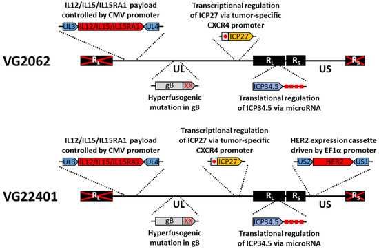 Standard bacterial artificial chromosome recombineering techniques were used to construct HER2-expressing recombinant HSV-1 viruses based on HSV-1 strain 17 (Figure 1). The virus VG22401 incorporated a transcriptional and translational dual-regulated mechanism [25], and was further engineered to express a cytokine payload consisting of IL12, IL15, and the IL15 alpha receptor subunit isoform 1. VG22401 also included a truncated form of gB to enhance viral spread, and additionally encoded an expression cassette for the extracellular domain of HER2, while the backbone virus VG2062 lacked the HER2 expression cassette but was otherwise identical to VG22401.