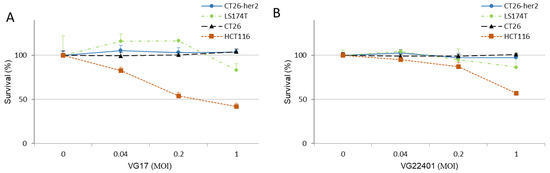 Cytotoxic effect of VG22401 and VG17 in human and mouse cancer cells in vitro. Cell survival percentages were determined using a Cell Counting KIT 8 assay to evaluate the cytotoxic effects of VG17 (A), and VG22401 (B) viruses in human cancer cell monolayers (HCT116 and LS174T) and mouse cancer cell monolayers (CT26 and CT26-HER2) at 72 h after infection with MOIs of 0.04, 0.2, and 1.