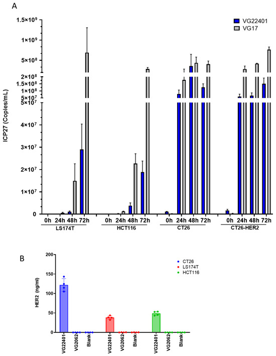 Virus replication and payload expression in human and mouse colorectal cancer cells in vitro. (A) Cells were infected with VG22401 or VG17 viruses. LS174T and HCT116 human colon cancer cells were infected at MOI = 0.001; CT26 and CT26-HER2 murine colon cancer cells were infected at MOI = 3. All infections were carried out in duplicate. Total DNA was extracted from the samples at the indicated times post-infection. To determine viral yield, ICP27 gene copy numbers were quantified by qPCR. (B) To determine HER2 payload expression, CT26, LS174T, and HCT116 cells were infected with HER2-expressing VG22401, or with the backbone virus VG2062. LS174T and HCT116 human colon cancer cells were infected at MOI = 3; CT26 murine colon cancer cells were infected at MOI = 6. Supernatants were collected 48 h post-infection. All infections were carried out in duplicate. Concentration of HER2 in the supernatant of the infected cells was analyzed by ELISA.