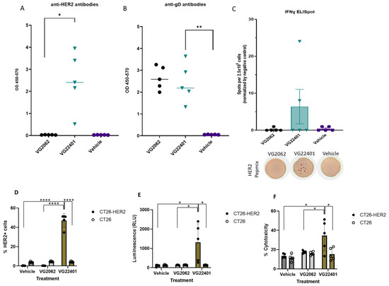 Induction of humoral and cellular immune response by an HSV-1 expressing HER2. Humoral immune response to HER2 (A) or oHSV-1 (B) after vaccination with VG22401 (black dots) and VG2062 (green triangles) viruses was evaluated by ELISA. Serum isolated from mice 35 days post-vaccination was diluted in series and incubated on plates pretreated with recombinant HER2 protein or with HSV-1 envelope glycoprotein D (gD). Anti-HER2 and anti-gD IgG antibody levels were measured with HRP-conjugated goat anti-mouse IgG and TMB, and absorbance at 450 nm was quantified (optical density). Plots show median values. An unpaired t-test was performed, and two-tailed p-values < 0.05 (*) and p < 0.002 (**) are shown. (C) Cellular immune response was measured by IFNγ ELISPOT assay with splenocytes isolated from mice. ELISPOT bar graph shows mean frequencies of IFNγ spots induced by HER2 peptide mix stimulation per 2.5 × 105 splenocytes. Error bars indicate SEM. The bottom panel shows representative wells with IFNγ spots after stimulation with HER2 peptide mix. (D–F) Binding of serum anti-HER2 antibodies to HER2-expressing tumor cells. CT26-HER2 and HER2-negative parental CT26 cells were co-incubated with 1:100 dilution of serum followed by APC-conjugated, anti-mouse IgG antibody. The antibody binding to cell-surface-expressed HER2 was measured by flow cytometry (*, p < 0.05; ****, p < 0.0001) (D). Antibody-dependent cell-mediated cytotoxicity (ADCC) was measured against CT26-HER2 and CT26 cells using mFcgRIV ADCC Reporter Bioassay. Target cells were seeded, incubated at 37 °C overnight, and pre-incubated with 1:500 dilution of serum for 15 min at room temperature. Effector cells were subsequently applied per the manufacturer’s instructions. Effector to target ratio = 10:1 was tested. After 6 h of co-incubation, Bio-Glo™ Reagent was added, and luminescence was measured (*, p < 0.05) (E). Complement-dependent cytotoxicity (CDC) was assessed against CT26-HER2 and CT26 cells. Target cells were pre-incubated with 1:100 dilution of serum for 1 h at room temperature, and rabbit complement (1:100 dilution) was subsequently added for 2.5 h. Lactate dehydrogenase (LDH) released in the culture medium was measured and the percentage cytolysis was reported (*, p < 0.05) (F).