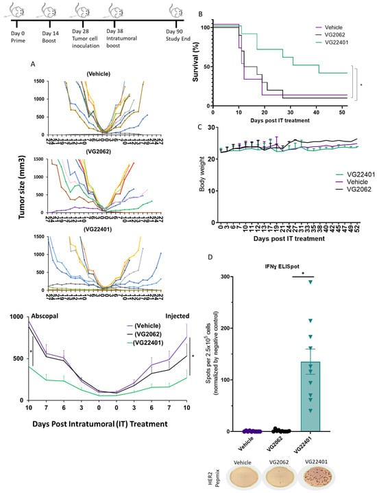 We further examined the effect of each therapeutic regimen on immunological modulation, particularly the induction of anti-HER2 T cell responses. Thus, when the mice reached an endpoint due to tumor burden, we collected their spleens to assess the T cell response induced by different treatment groups. IFNγ ELISPOT assay revealed that mice treated with VG22401 showed an increase in IFNγ production after being stimulated with HER2 PepMix, when compared to splenocytes from mice treated with VG2062 or the vehicle control (Figure 5D).
