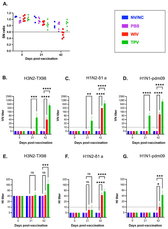 Antibody response. (A) Antibodies against IAV-S NP. Data are expressed as the sample-to-negative (S/N) ratio. A dotted line at S/N of 0.6 represents the cut-off limit for the assay. Samples with S/N value above the cutoff line are considered negative for the NP antibodies. NV/NC, neither vaccinated nor challenged. PBS, mock vaccination. WIV, whole-inactivated virus vaccine. TPV, trivalent PICV-vectored vaccine. (B–D) Virus-neutralizing antibody titers against the H3N2-TX98, H1N2-δ 1a, and H1N1-pdm09 strains, respectively. (E–G) Hemagglutination inhibition (HI) antibody titers measured against the H3N2-TX98, H1N2-δ 1a, and H1N1-pdm09 strains, respectively. For the VN and HI, the dotted lines at the dilution of 1:10 indicate the assay’s detection limit. Samples with undetectable activity at this dilution were considered negative and were assigned a value of 5 for graphical and statistical purposes. ns: no significant, * p ≤ 0.05; ** p ≤ 0.01; *** p ≤ 0.001; **** p ≤ 0.0001.