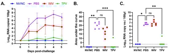 The area under the curve (AUC) was calculated to assess the overall extent of IAV-S shedding across the 5-day observational period. The TPV group had a significantly smaller AUC than the PBS group (Figure 2B). The WIV group had a comparatively smaller AUC than the PBS group, but this difference did not reach statistical significance. As expected, no AUC values were observed in the NV/NC group, because no IAV-S genomic RNA was detected in nasal swabs of those pigs.