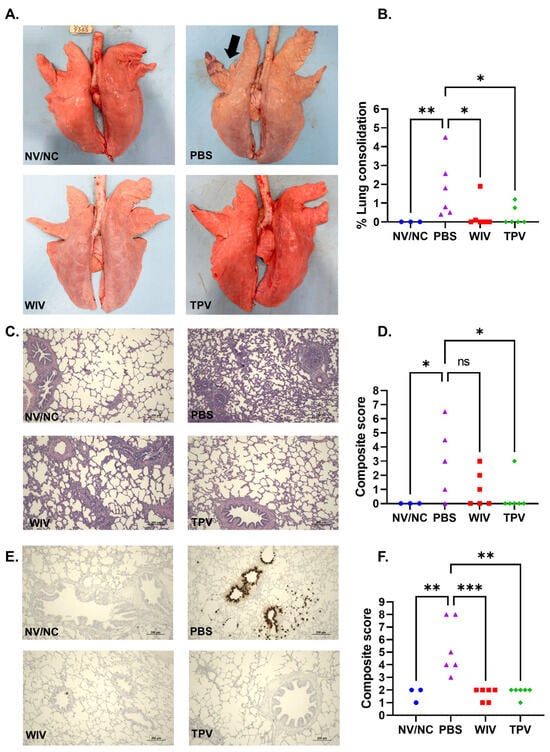 Pigs in the NV/NC group did not exhibit noticeable microscopic lung lesions (Figure 3C,D). The lungs from the pigs in the PBS group presented mild peribronchiolar lymphocytic cuffing, necrosis of bronchiolar epithelial lining, and low levels of interstitial pneumonia (Figure 3C), with the composite microscopic lung scores ranging between 0 and 9 (Figure 3D). Three out of the six pigs in the WIV group displayed microscopic lesions, scoring between 1 and 3. Only one pig in the TPV group showed mild microscopic lesions. Consequently, the TPV group’s microscopic lung lesion scores were statistically lower than those of the PBS group (Figure 3C,D).
