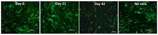 Assessment of neutralizing antibodies against the PICV vector. Plasma samples obtained from pigs in the TPV group on days 0, 21, and 42 p.v. were subjected to a 2-fold serial dilution in DMEM in a 96-well plate and then incubated with an equal volume of 100 TCID50 of the PICV-GFP. After a 1 h incubation, the plasma–virus mixture was transferred to a new 96-well plate containing BHK-21 cells. GFP signals were visualized using a fluorescence microscope at 48 h post-inoculation. The displayed images correspond to the plasma samples at the dilution 1:4.