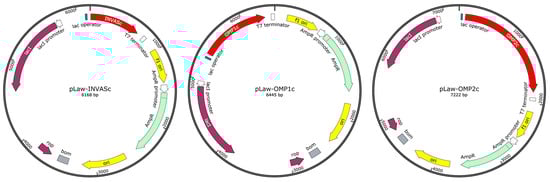 DNA sequences of chimeric antigens were individually cloned into the expression vectors: pLawINVASc, pLawOMP1c, and pLawOMP2c (Figure 1). E. coli strain SHuffle® T7 was transformed with the three plasmids. Individual clones of each construction were confirmed by SDS-PAGE and Western blot to further prepare master and work benches with selected clones. Ten litter batch cultures were grown in the Winpact FS-06 fermenter (Major Science, Saratoga, CA, USA), using 1 L of inoculum and 9 L of Terrific broth (TB) medium. Inoculum comprised four cultures with 250 mL Luria Bertani broth (Lioilchem, Roseto degli Abruzzi, TE, Italy) plus ampicillin 100 μg/mL (USBiological, Salem, MA, USA) (LBA). After fermenter inoculation, batch cultures supplemented with ampicillin 100 μg/mL were grown for 10 h at 37 °C under constant stirring at 150 rpm, dissolved oxygen over 20%, and pH 7.5 by the addition of 25% (v/v) NH3OH or 20% (v/v) H3PO4 []. Recombinant antigens were induced at an optical density (OD) of around 1, using 0.75 mM isopropyl β-d-1-thiogalactopyranoside (IPTG) (Santa Cruz Biotechnology, Santa Cruz, CA, USA) for 6 h. OD was measured at 600 nm (OD600) in the spectrophotometer UV-2505 (Labomed, Inc., Los Angeles, CA, USA), and the dry cell weight (DCW) was determined at 90 °C in a moisture analyzer (Radwag, Radon, Poland). One OD unit corresponded to 0.49 g DCW/L.