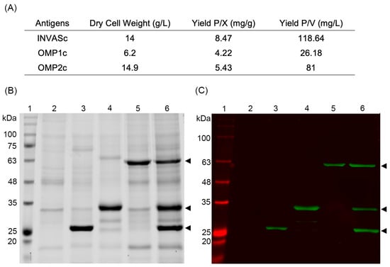 Antigen production and characterization. Chimeric antigens were expressed individually as inclusion bodies in 10 L fermentations, using the E. coli strain SHuffle® T7 as the host. (A) Protein yields of INVASc, OMP1c, and OMP2c. Characterization of chimeric antigens by SDS-PAGE (B) and Western blot (C). Lane 1, molecular weight marker AccuRuler RGB Plus prestained protein ladder (Maestrogen, Taiwan); lane 2, negative control (untransformed bacteria); lane 3, INVASc; lane 4, OMP1c; lane 5, OMP2c; and lane 6, mixture of the three chimeric antigens. Arrowheads indicate the three chimeric antigens.