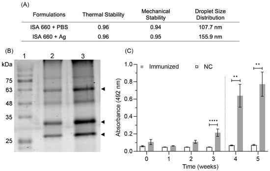Antigens contained within the vaccine candidate and the commercial vaccine were separated from the emulsions by adding benzyl alcohol until reaching 10% (v/v). The mixture was vortexed at room temperature (RT) for 20 min and centrifuged at 16,100× g for 10 min. The aqueous phase containing the proteins of interest was analyzed by SDS–PAGE [].