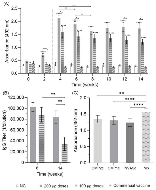 The first immunization in pigs induced a significant antibody production at week two with 200 μg of the vaccine candidate (Figure 4A). After the booster, antibody levels abruptly increased in the two groups immunized with the vaccine candidate, showing significant differences with positive and negative control groups. Antibody levels of pigs immunized with 200 μg were significantly higher than their counterparts of 100 μg at weeks 4, 6, 12, and 14. Only in weeks 8 and 10, there were no significant differences in antibody levels between the two doses administered. Remarkably, the ELISA assay coating with the chimeric antigens did not recognize antibodies in the sera of pigs immunized with the commercial vaccine Porcilis® Ileitis as a positive control, and the antibody detection in this experimental group was on par with the negative control during the entire experiment.