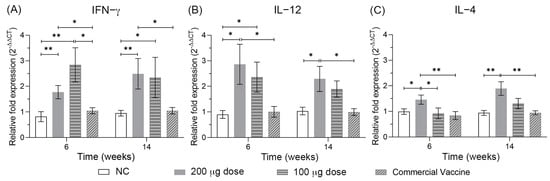 Although IL-12 transcripts showed a higher level at 200 μg dose than the values obtained for 100 μg dose at both times measured, there were no significant differences between them (Figure 5B). Meanwhile, the IL-4 transcript levels were lower than those obtained for IFN-γ and IL-12 (Figure 5C). We did not detect cytokine expression in lymphocytes isolated from animals immunized with the commercial vaccine.