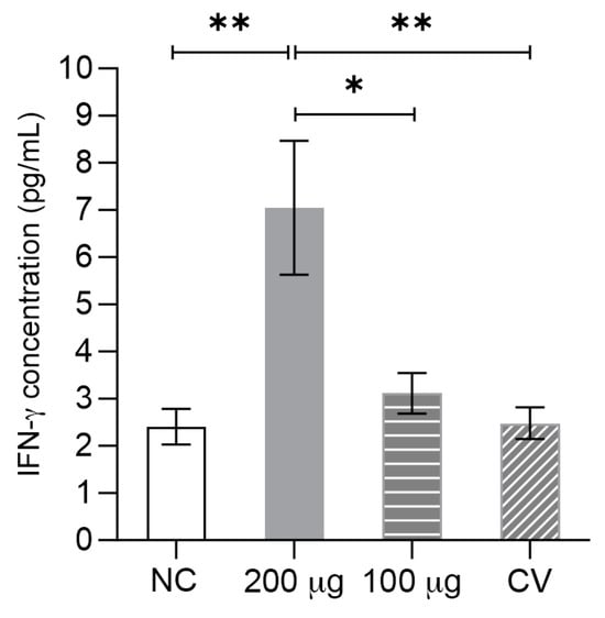 IFN-γ is a crucial cytokine in the Th1 cellular response, which induces the removal of infected cells with the intracellular pathogen. As IFN-γ transcript levels were significantly increased in the longer time evaluated (14 weeks) during the previous assay, we also measured IFN-γ cytokine levels in the supernatant of lymphocyte cultures with a commercial ELISA kit. The results revealed a significant increase in IFN-γ levels at a 200 μg dose, with values around 7 pg/mL (Figure 6). No levels of IFN-γ were detected in the commercial vaccine group.