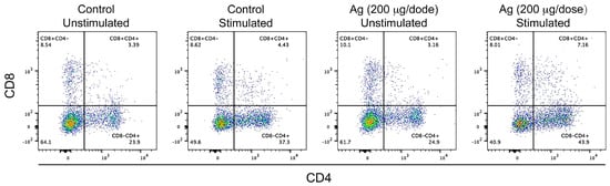 Abrupt lymphocyte proliferation and differentiation upon antigen encounter characterize a cellular immune response. Therefore, we evaluated the proliferation of TCD4 and TCD8 lymphocyte populations, using the samples of animals immunized at week 14 with a dose of 200 μg after being stimulated with the same mixture of L. intracellularis antigens used in the preceding assays. After counting 10,000 events for each experimental group via flow cytometry, a substantial increase in TCD4+CD8− and TCD4+CD8+ lymphocyte populations was observed in the experimental group with the 200 μg dose stimulated with L. intracellularis antigens compared with the unstimulated group and negative controls (Figure 7). This result suggests that mainly TCD4+ lymphocytes could be responsible for the pattern of cytokine expression observed before, constituting an important stimulus for the TCD8+ population to activate and eliminate infected cells.