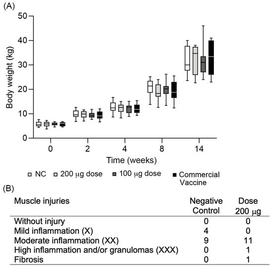During the immunization experiment in pigs, body weight, changes in animal behavior, fever, weight loss, diarrhea, and other clinical manifestations that could indicate an adverse reaction to the vaccine candidate were evaluated. A steady increase in animal weight was observed with no significant difference between experimental groups (Figure 8A). There were no behavioral changes, diarrhea, or variation in the consistency and color of feces, thus indicating that no L. intracellularis infection occurred during the experiment.