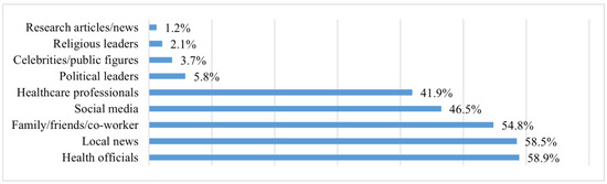 We asked participants to choose their primary sources of information regarding the COVID-19 vaccine from a list of nine information sources (i.e., healthcare professionals, health officials, local news, family/friends/co-workers, social media, celebrities/public figures, religious leaders, political leaders, and other). These sources were selected based on findings from the previous literature [16,17]. Participants could pick more than one information source option.