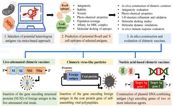 The strategies applicable for new-generation chimeric vaccine development include reverse vaccinology and omics-based approaches such as genomics and proteomics. Reverse vaccinology is a revolutionary in silico data-based approach to vaccine development. The strategy involves the computational rational designing of chimeric vaccines via rigorous genome screening or analysis, followed by selecting putative antigens and epitopes with immunogenic capabilities. It has been widely used to develop chimeric vaccines even against non-cultivable pathogens whose whole genome sequence is available. Moreover, developing omics-based chimeric vaccines in a shorter time eliminates the hurdles of vaccine stockpiling for re-emerging diseases []. Figure 1 illustrates the in silico strategies to develop different types of chimeric vaccines.