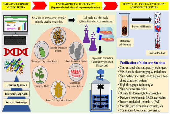 The process development of chimeric vaccines has been divided into two main parts, i.e., upstream and downstream bioprocessing. The upstream development involves selecting and cloning synthetic genes in expression vectors, followed by transformation and protein expression in heterologous hosts. In contrast, the downstream processing consists of the purification and formulation of the vaccine candidates, which is essential to obtain regulatory approvals []. A schematic representation of the different stages involved in chimeric vaccine development has been given in Figure 2.