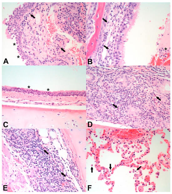 Representative photomicrographs of histopathological changes on day 14 post-challenge as observed in the nasal turbinates (A,B), trachea (C,D), bronchus (E), and lung (F) of cats infected with SARS-CoV-2 following mock vaccination (A,C,E) or SARS-CoV-2 vaccination (B,D,F). (A) Nasal turbinates of an unvaccinated, challenged cat (ID M192790) with epithelial attenuation (asterisks) and neutrophilic and lymphoplasmacytic inflammation in the lamina propria (arrows). (B) Nasal turbinates of a vaccinated, challenged cat (ID M191806) showing neutrophilic and lymphoplasmacytic inflammation in the lamina propria (arrows) and lumen (asterisk). (C) Trachea from an unvaccinated, challenged cat (ID M192790) with epithelial attenuation and segmental loss of cilia (asterisks). (D) Trachea from a vaccinated, challenged cat (ID M192812) exhibiting neutrophilic and lymphoplasmacytic inflammation around tracheal glands (arrows). (E) Bronchus from an unvaccinated, challenged cat (ID M192790) showing lymphoplasmacytic inflammation (arrows) and loss of bronchial glands. (F) Lung from a vaccinated, challenged cat (ID M192812) showing neutrophilic exudation into the alveoli (arrows) and congestion. Original magnification of all images: 400×.
