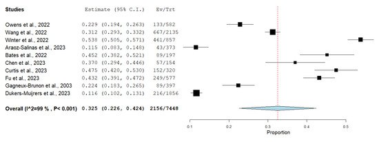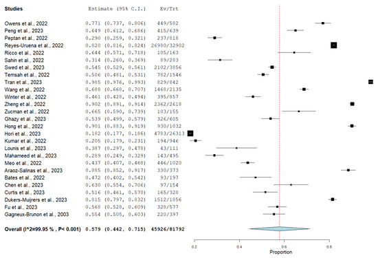 3.9. Subgroup Meta-Analysis According to the Population Willingness to Receive Monkeypox Vaccine