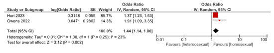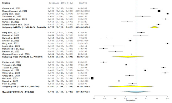 | Hori et al., 2023 [18] | Japan | Cross-sectional | 26,313 | 12,900/13,413 | 48 ± 16.8 | The general population and gays | Vaccine acceptance was higher among homosexual participants than heterosexual participants. |