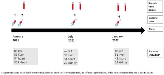 Liver, heart, and kidney transplant recipients from three different institutions in Barcelona, Spain, received four doses of the mRNA-1273 SARS-CoV-2 vaccine. The first dose of 100 mcg was administered in the deltoid area, followed by the second dose four weeks later. The third and fourth doses were administered almost six months after the previous dose, following our national policy. Patients who received multi-organ transplants were excluded from the study.
