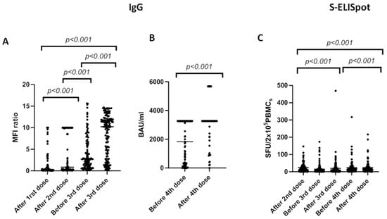 Anti-S SARS-CoV-2-specific IgG increased from 1.8 [0.05–10] (after the first dose of vaccine) to 4.32 [0.05–10] (after second dose) (p < 0.001), and from 4 [0.1–15.6] before the third dose to 8 [0.1–14.7] after third dose (p < 0.001). To assess antibody response before and after the fourth vaccine dose, we used a chemiluminescent immunoassay and found a mean value of 1804 [0.6–3270] before the fourth dose and 2947 [0.6–5680] after the fourth dose (BAU/mL).