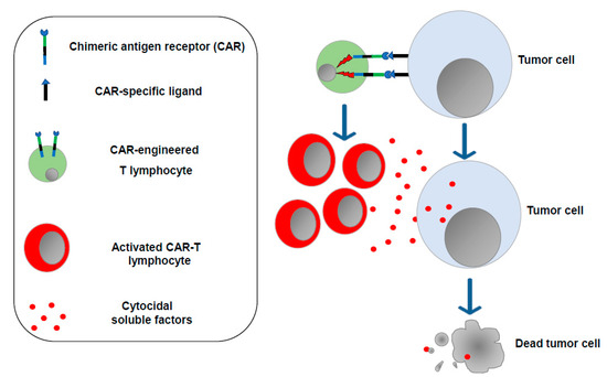 CAR-T lymphocytes. T lymphocytes are isolated from the cancer patient (or from a compatible donor) and transduced in vitro to express the chimeric antigen receptor of choice. After expansion, engineered T lymphocytes are reinfused into the patient, where they can recognize and destroy the tumor cells.