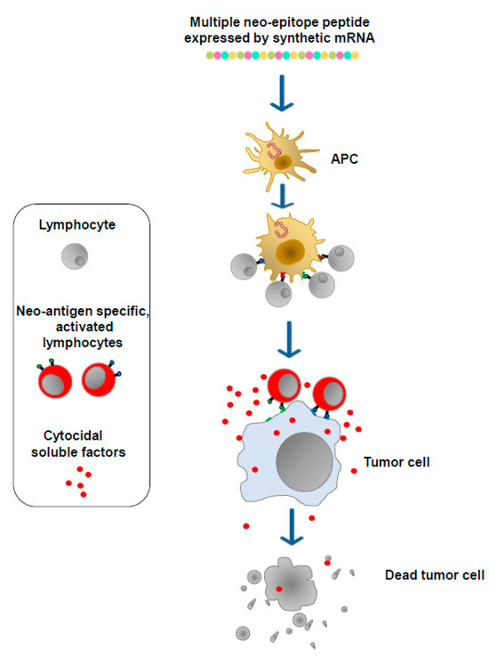 Cancer cells express, in addition to well-known TSAs and TAAs, a plethora of unidentified proteins defined neo-antigens which bear potentially immunogenic epitopes and whose patterns vary among both patients and tumor types. These products are the targets of mRNA-based antitumor vaccines, which are designed to generate neo-antigen-specific T lymphocytes. To this end, DNA from both the tumor and normal tissues of a patient is sequenced to detect genetic changes unique to the patient’s tumor. Then, to identify neo-antigens, mRNA purified from tumor cells is sequenced to assess which of the observed genetic changes is expressed. Through specific algorithms, candidate neo-antigens, including genetic changes unique to the tumor and potentially associating with either the major histocompatibility complex (MHC) Class I or Class II of the patient, are selected, and the corresponding sequences are included in synthetic mRNA molecules. After association with synthetic lipidic nanoparticles, the mRNA molecules are then injected either intradermally, intramuscularly, or intravenously. In this way, the vaccine nanovesicles can enter any kind of cell. In the case of their entry into APCs, multiple neo-epitope peptides can be processed and presented on MHC complexes soon after translation. Otherwise, multiple neo-epitope peptides can be internalized and processed by APCs after their secretion from target cells. Neo-epitopes presented by dendritic cells (DCs) as well as other APCs select and activate both CD4+ and CD8+ T lymphocytes which, in this manner, acquire the ability to attack and destroy tumor cells expressing the neo-antigens (Figure 3).
