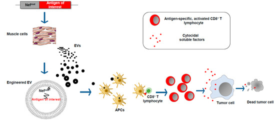 Early in vitro experiments strongly supported the idea that the entry of Nefmut-engineered EVs into APCs results in the cross-presentation of EV-incorporated antigens and the activation of antigen-specific CD8+ T lymphocytes [26]. CD8+ T cell immunogenicity was then confirmed in in vivo experiments, first by injecting in vitro-engineered EVs and afterward by engineering EVs spontaneously released by muscle cells upon the injection of DNA vectors expressing Nefmut-based fusion products (Figure 4) [28].
