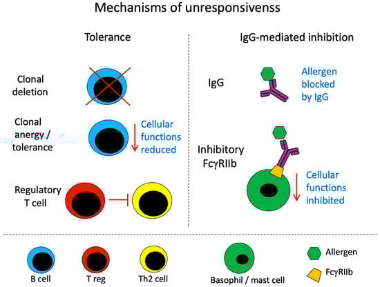 From an immunological point of view, the induction of tolerance reflects the modification of a cellular state by which lymphocytes are deleted from the system, become anergic/tolerized, or are suppressed by regulatory T cells [5,6,7] (Figure 1). Hence, tolerance reflects an active process in the immune system in order to avoid unwanted immune responses at the cellular level. The term ‘unresponsiveness’ does not invoke any type of mechanism regarding the unresponsiveness of the system, but simply measures and describes a lack of response [8]. In the case of AIT, the measured absence of a response is an allergic response. Thus, the term ‘unresponsiveness’ in allergy simply indicates an absence of response rather than implying a specific tolerizing mechanism.