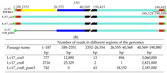 In the Lv17_cos5 and Lv17_cos8 stocks, the major viral component of the quasispecies lost around 40 kb (2352–40,568) of its left terminus, encoding at least 52 genes, and was substituted by a viral fragment of nearly similar size (40,447 bp, coding at least 51 genes) translocated from the right terminus of the genome (Table 2). In both passages, a relatively small number of viral reads (907 and 3 reads in Lv17_cos5 and Lv17_cos8, respectively) could still be mapped to the region of the genome between the proximal endpoint of the inverted terminal repeat and the deletion breakpoint (2352 and 40,568, respectively), indicating the presence of other genotypic variants as minor components in the virus mix (Figure 1).