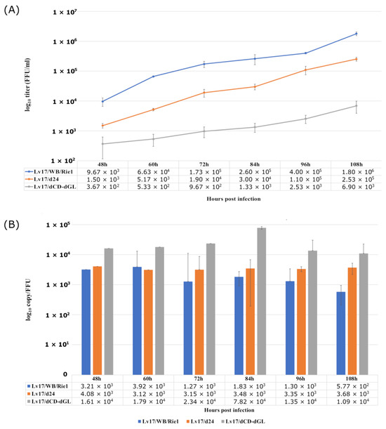 Growth characteristics of the mutant viruses Lv17/WB/Rie1-Δ24 and Lv17/WB/Rie1-ΔCD-ΔGL and their parental strain Lv17/WB/Rie1. PAMs were infected (MOI = 0.01), aliquots were taken every 12 h from 48 h to 108 h, and virus yields were determined by titration. (A) Mean values and standard errors of three parallel experiments. (B) Variations in specific infectivity (calculated as genome copy/mL to FFU/mL ratio).