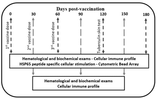 Statistical analysis was carried out with Prism 9.0 software (Graph-Pad, San Diego, CA, USA). The two-way ANOVA with the Sidak correction was used to compare DNA-hsp65 vaccinated and control group. The Sidak multiple comparisons test was used to compare statistical differences between the groups for each time point evaluated, before and after vaccination. Paired intragroup comparisons were used to analyze statistical differences among time points. A p value of <0.05 was considered significant. Clinical, biochemistry, hematological, and immunological data were analyzed as follows: (i) data from the DNA-hsp65 vaccinated animals were compared with their own baseline data by paired T-test analysis, and (ii) data from the EP-pVAX-hsp65-DNA vaccinated group was compared with the control group (intergroup unpaired analysis).