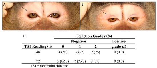 Tuberculin skin test (TST) analyses were performed twice before and four months after the first vaccine dose using 0.1 mL of mammalian old tuberculin via intradermal palpebral skin test (Synbiotics, San Diego, CA, USA). Palpebral reactions were graded at 48 and 72 h with the standard 1 to 5 scoring system, as previously defined [38]. Grade 0—no cutaneous reaction; grade 1—bruise, with extravasation of blood in the eyelid; grade 2—palpebral erythema with minimal swelling; grade 3—moderate swelling with or without erythema; grade 4—well-defined palpebral swelling with drooping and presence of erythema; and grade 5—necrosis and marked swelling with eyelid closed or partially closed. Grades interpretation: grades 0, 1, and 2 were considered to be TST negative; grades 3, 4, and 5 were considered to be TST positive.