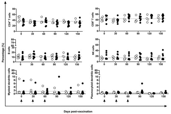 Frequency of immune cells in the peripheral blood. Frequency of CD4+ and CD8+ T cells, B cells, NK cells, myeloid dendritic and plasmocytoid dendritic cells in unvaccinated (open circles) and electroporated DNA-hsp65 vaccinated (black circles) cynomolgus macaques. Arrows represent the three doses of vaccine.
