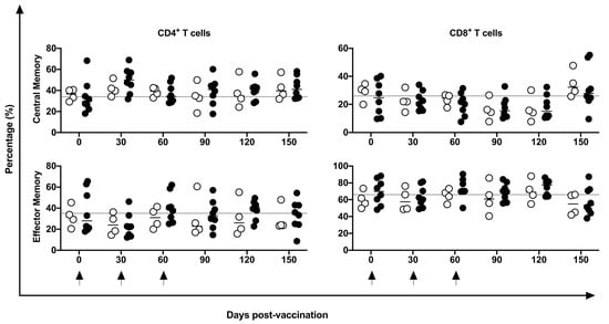 Frequency of central and effector memory cells in the peripheral blood. Frequency of CD4+ and CD8+ T CM and EF cells in unvaccinated (open circles) and electroporated DNA-hsp65 vaccinated (black circles) cynomolgus macaques. Arrows represent the three doses of vaccine.